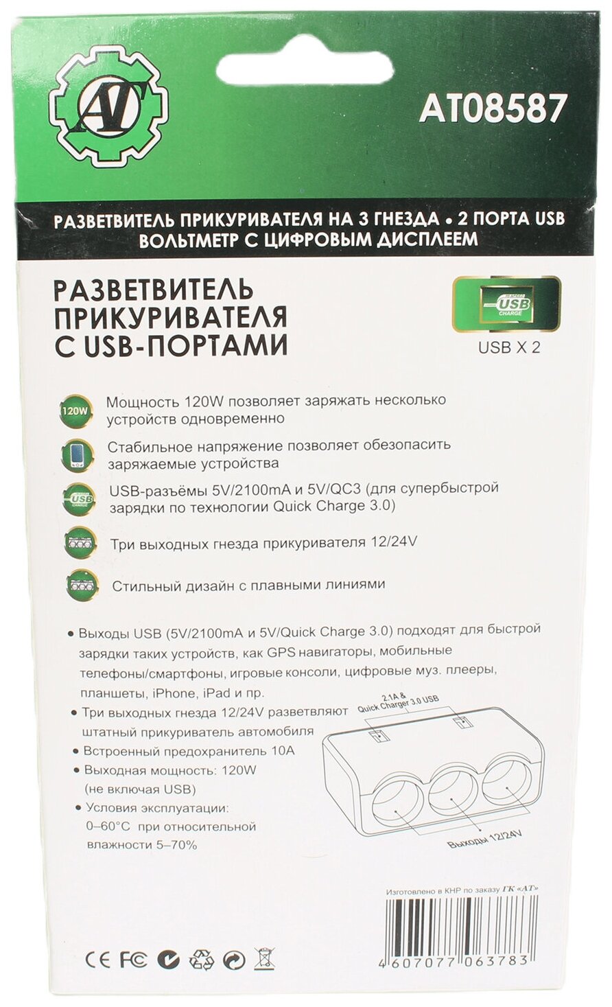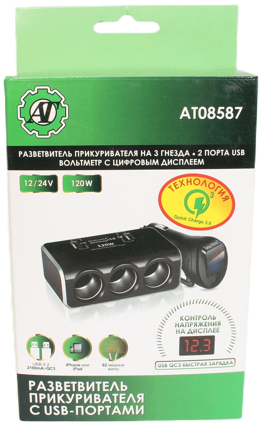 Разветвитель прикуривателя 12/24V на 3 гнезда 120W и 2USB разъема 5V-3.0А, 2.1А, вольтметр информация: