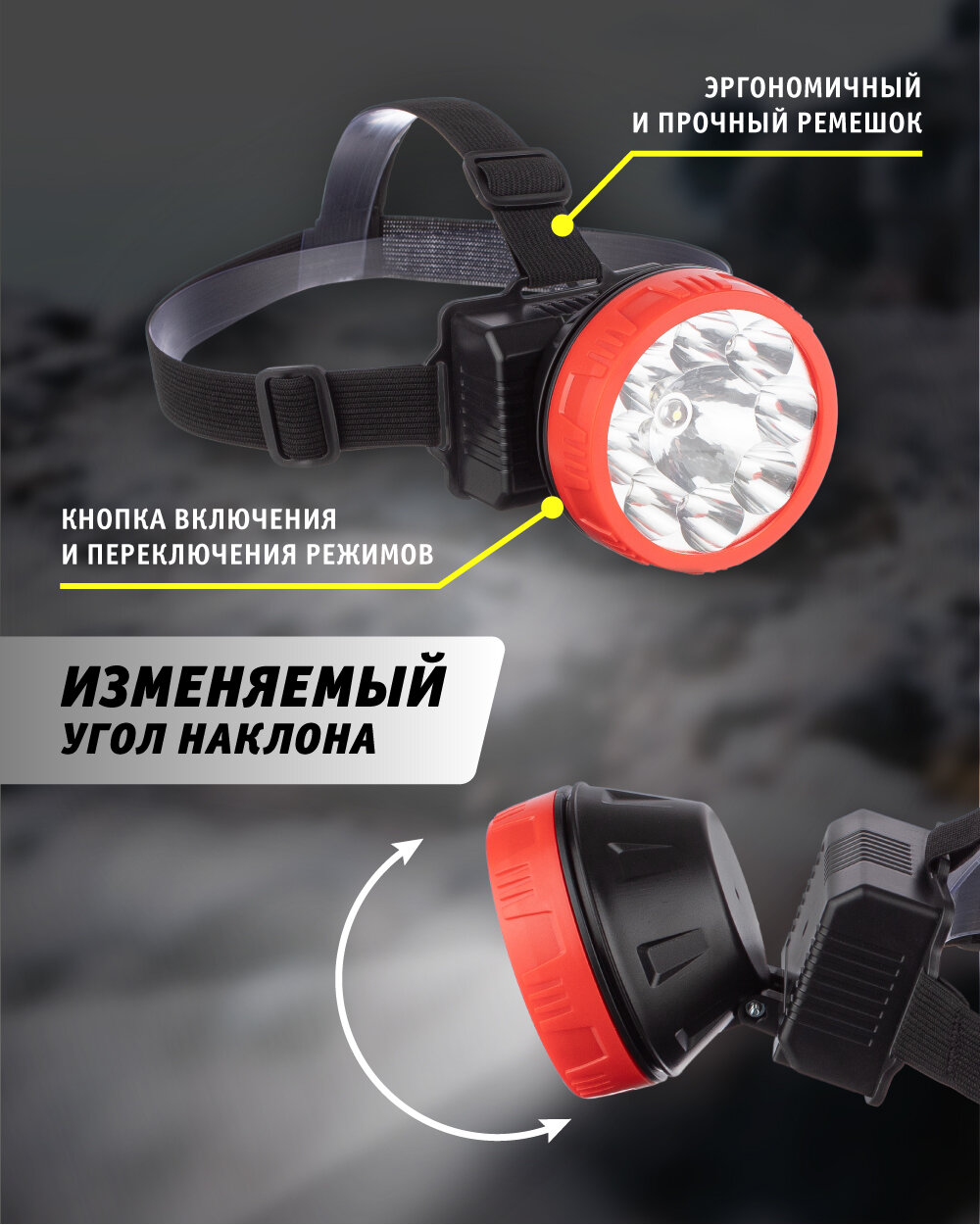 Фонарь налобный Navigator NPT светодиодный 9 LED 1 Вт аккумуляторный Lead-acid 900 мАч ударопрочный пластик 2 режима (14448) 980 ₽
