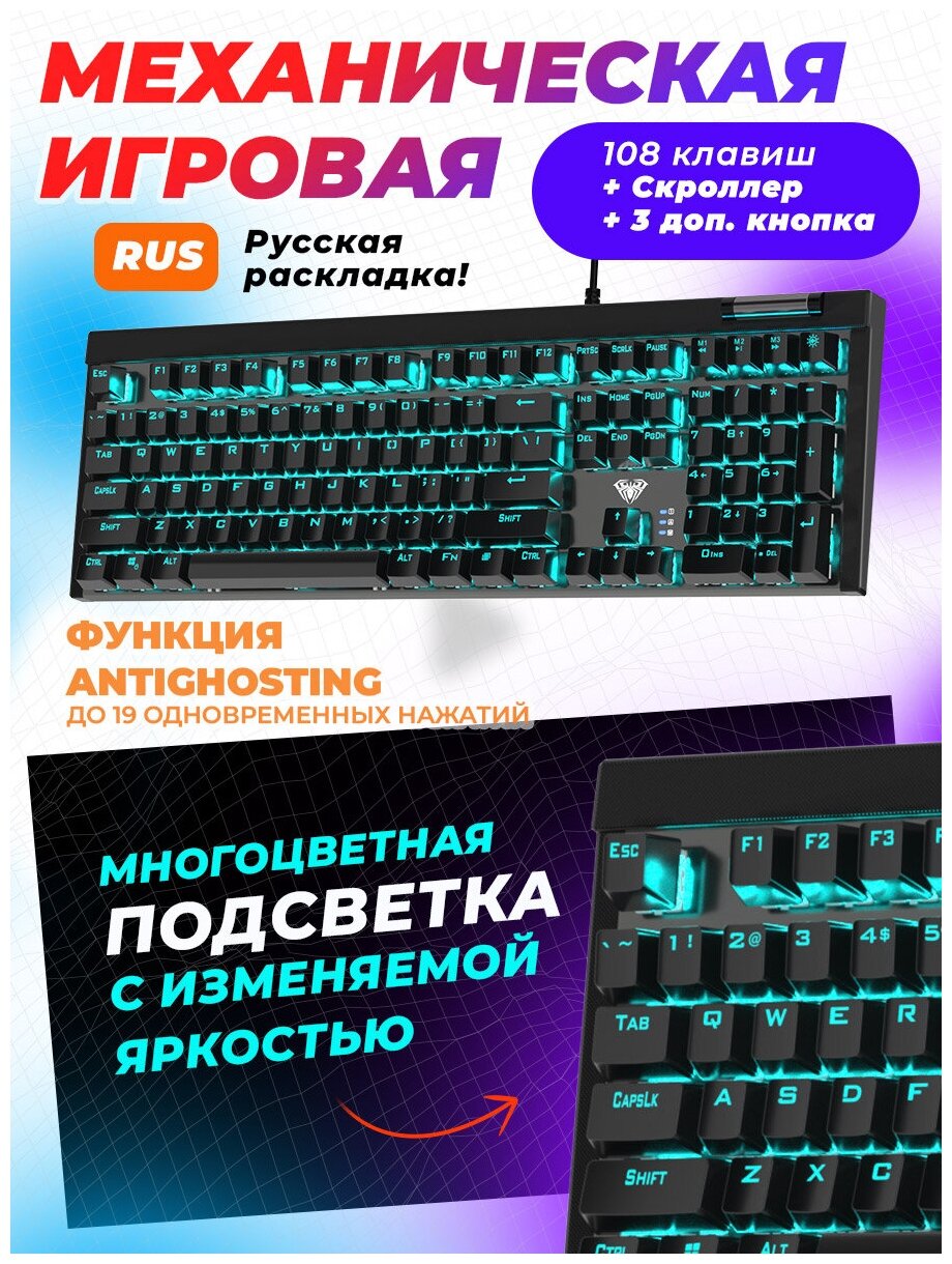 Клавиатура игровая AULA F3030 108 кл. механическая литая алюминий/пластик роллер+3кнопки RGB - чёрная 1.6м