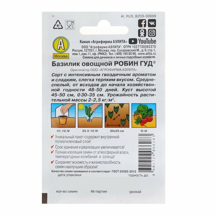 Семена Агрофирма аэлита Лидер Базилик овощной Робин Гуд 0.3 г