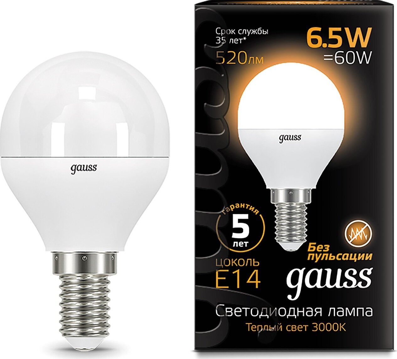 Отзывы на Лампа светодиодная Gauss 105101107 6.5Вт цоколь: E14 шар 220B 3000K цвет свечения белый теплый (упаковка: 10 штук)