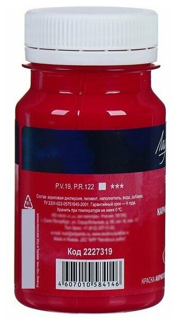 Краска акриловая художественная в банке 100 мл, ЗХК "Ладога", карминовая, 2227319 информация: