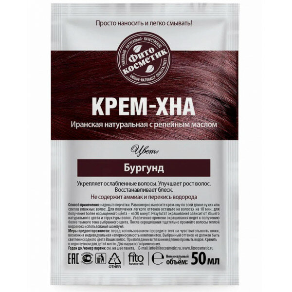 Fito косметик Крем-хна иранская натуральная с репейным маслом в готовом виде цвет бургунд, 50 мл
