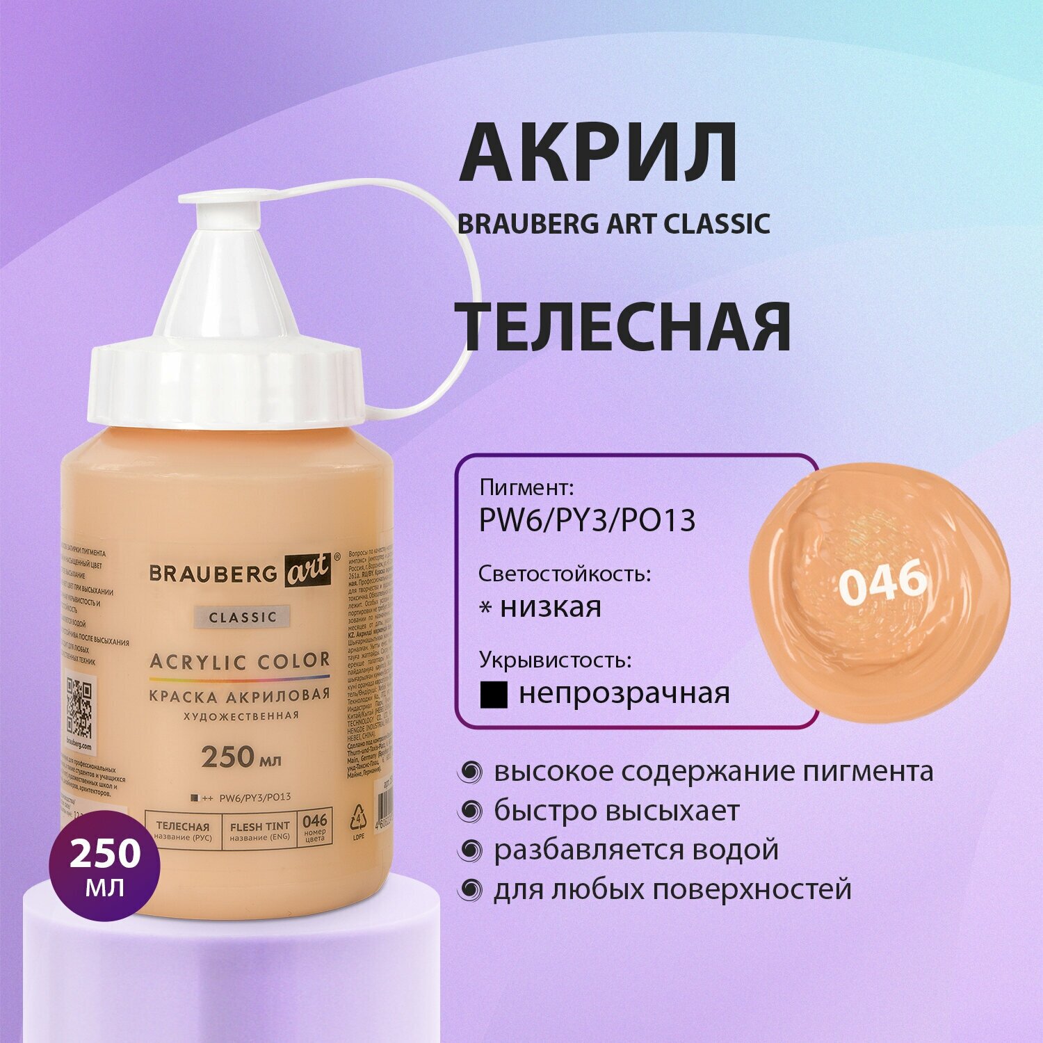 Краска акриловая художественная BRAUBERG ART CLASSIC, флакон 250 мл, телесная, 191708, 191708 538 ₽