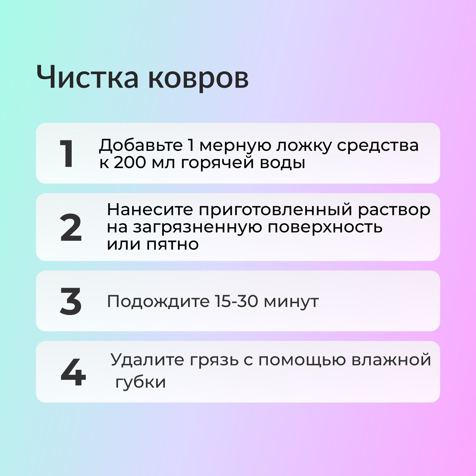 | Способ применения | для ткани с неустойчивым красителем предварительно проверьте пятновыводитель в незаметном месте; стирка: добавьте 3 мерных ложки средства при загрузке в стиральную машину; безопасен для цветных изделий и не ослабляет волокна; не используйте вместе с отбеливателем, содержащим хлор; выведение пятен и замачивание: добавьте 3 мерных ложки средства к 2 литрам воды горячей воды; для лучшего результата используйте воду с температурой не менее 60 градусов; чистка ковров: добавьте 1 мерную ложку средства к 200 мл горячей воды, нанесите приготовленный раствор на загрязненную поверхность или пятно и оставьте подействовать на 15-30 минут; чистка кухонных поверхностей (раковин, плит, керамических поверхностей): насыпьте порошок на влажную поверхность и дайте подействовать; удалите грязь с помощью влажной губки, ополосните поверхность; не применять для изделий из меди и алюминия |