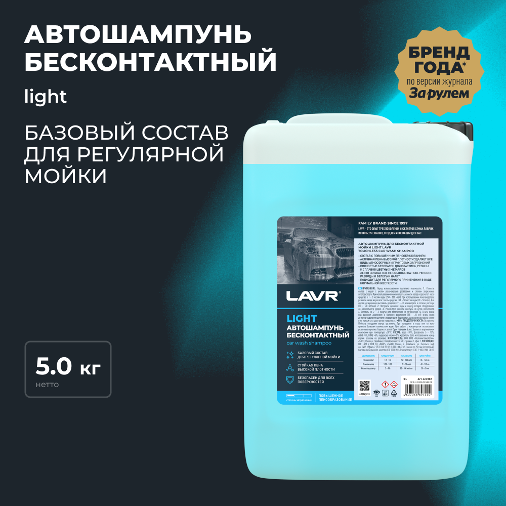 LAVR ln2302 автошампунь для бесконтактной мойки light базовый состав 3.0 (1:20-1:50)auto shampoo light 5 информация: