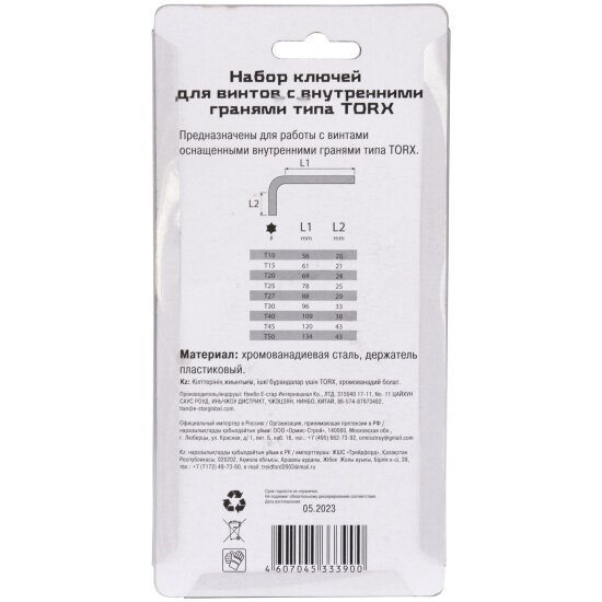 Набор имбусовых ключей TORX РемоКолор , 6 граней, 9 предметов 43-2-110 информация: