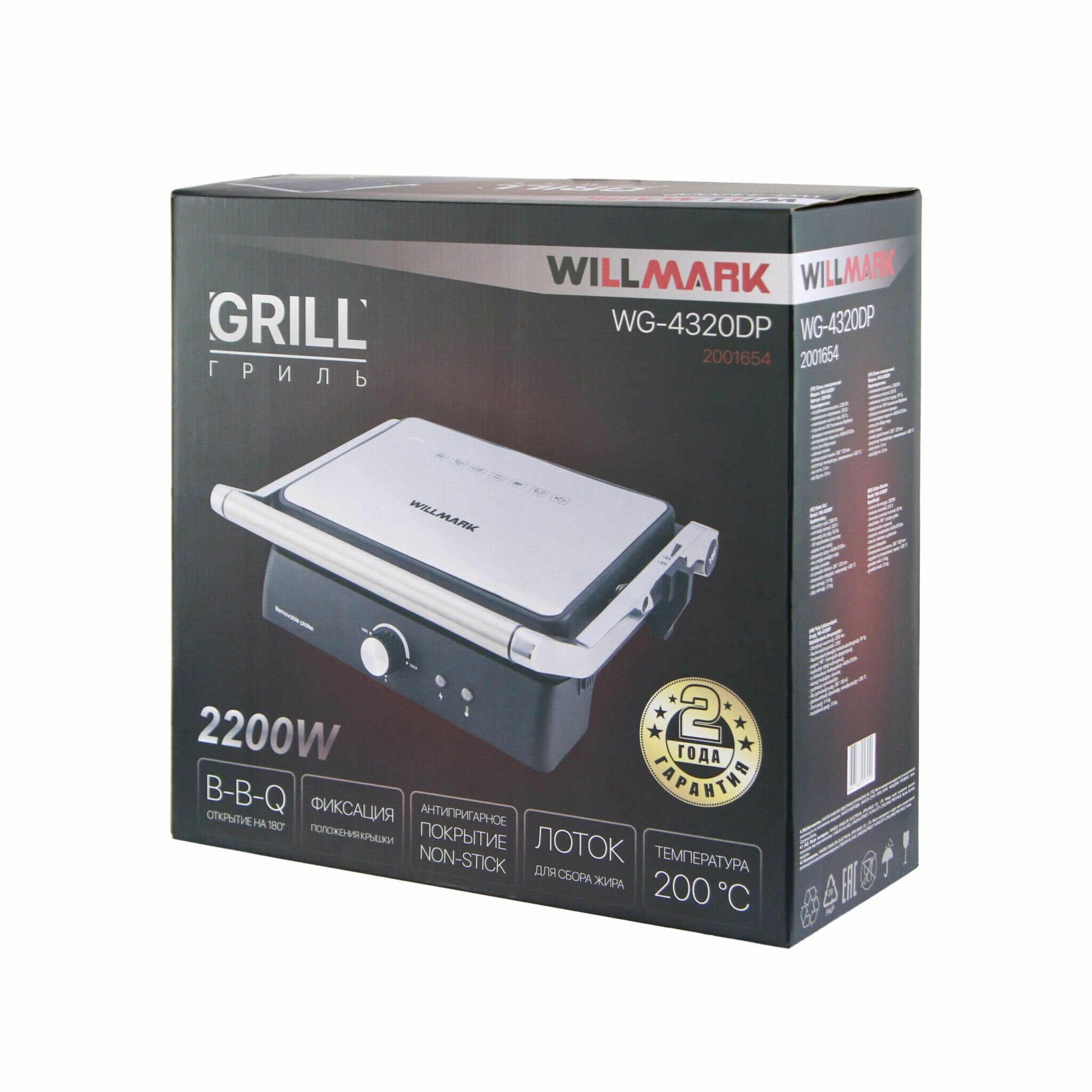 Гриль электрический WILLMARK WG-4320DP серебристый с черным, 2200 Вт