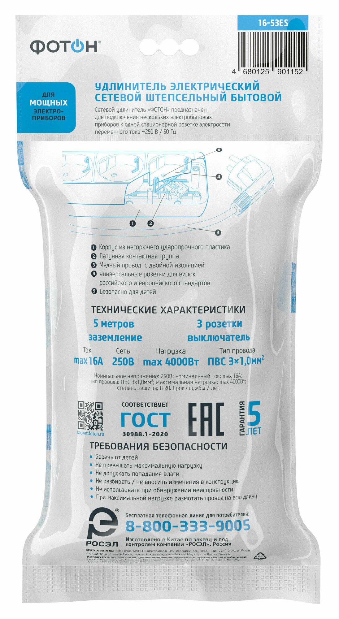Удлинитель сетевой "фотон" 16-53ЕS, 5 метров, 3 розетки, 16А, с выключателем, с заземлением, Белый, ГОСТ