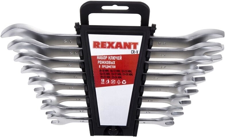 Набор ключей рожковых REXANT (8-24 мм), 8 шт., CrV, зеркальное хромирование
