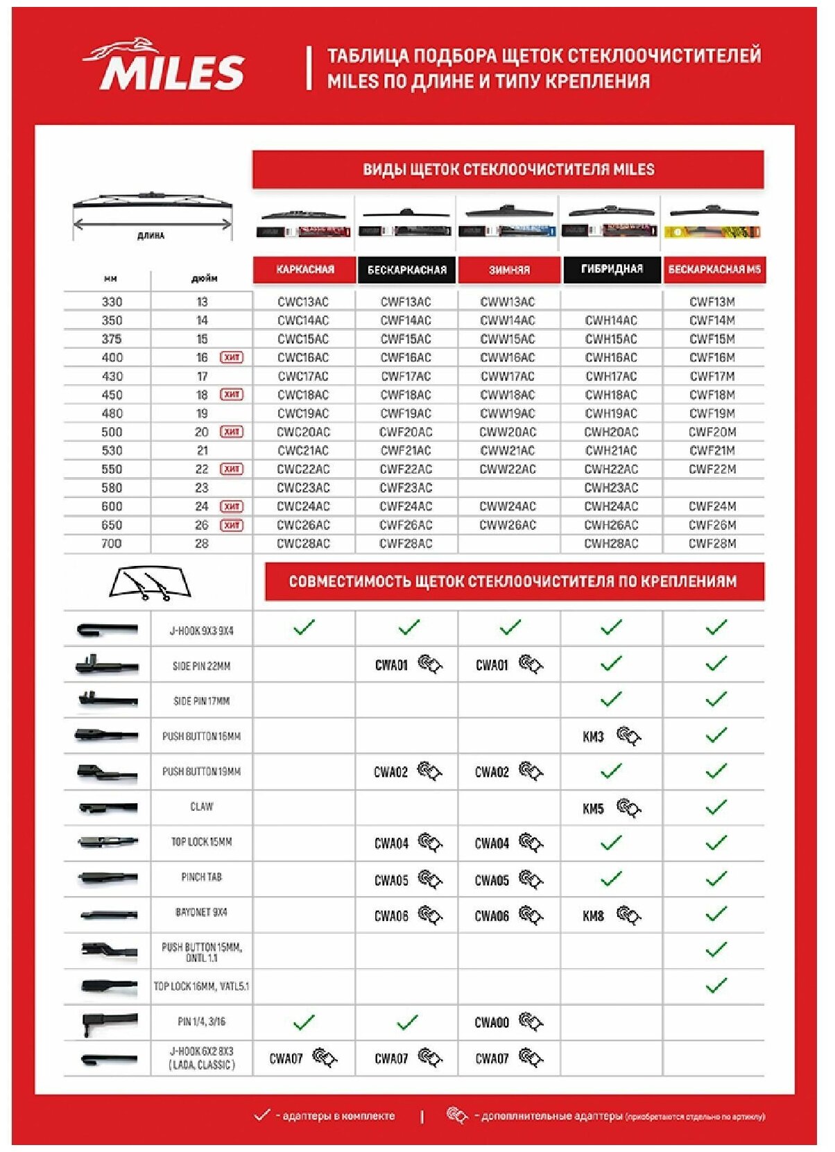 Замена на CWF13MA Щетка стеклоочистителя бескаркасная 330 мм (13 дюймов) (9 адаптеров) CWF13M Miles арт. CWF13M 652 ₽