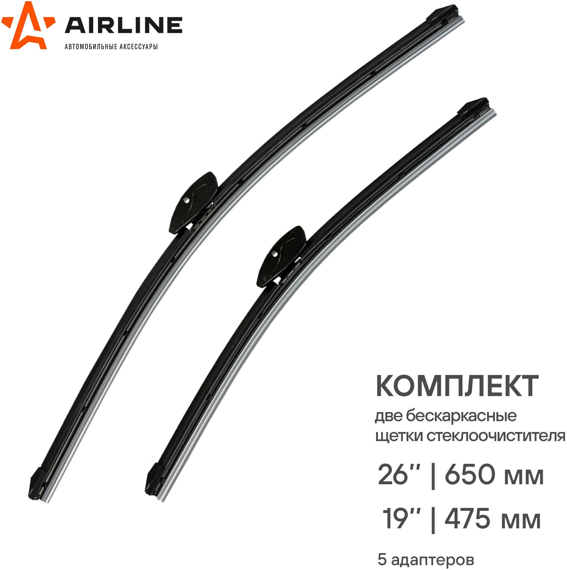Щетки стеклоочистителя бескаркасные 650/475 мм (26/19) 2 шт. 5 адаптеров Airline AWBBK650475K информация: