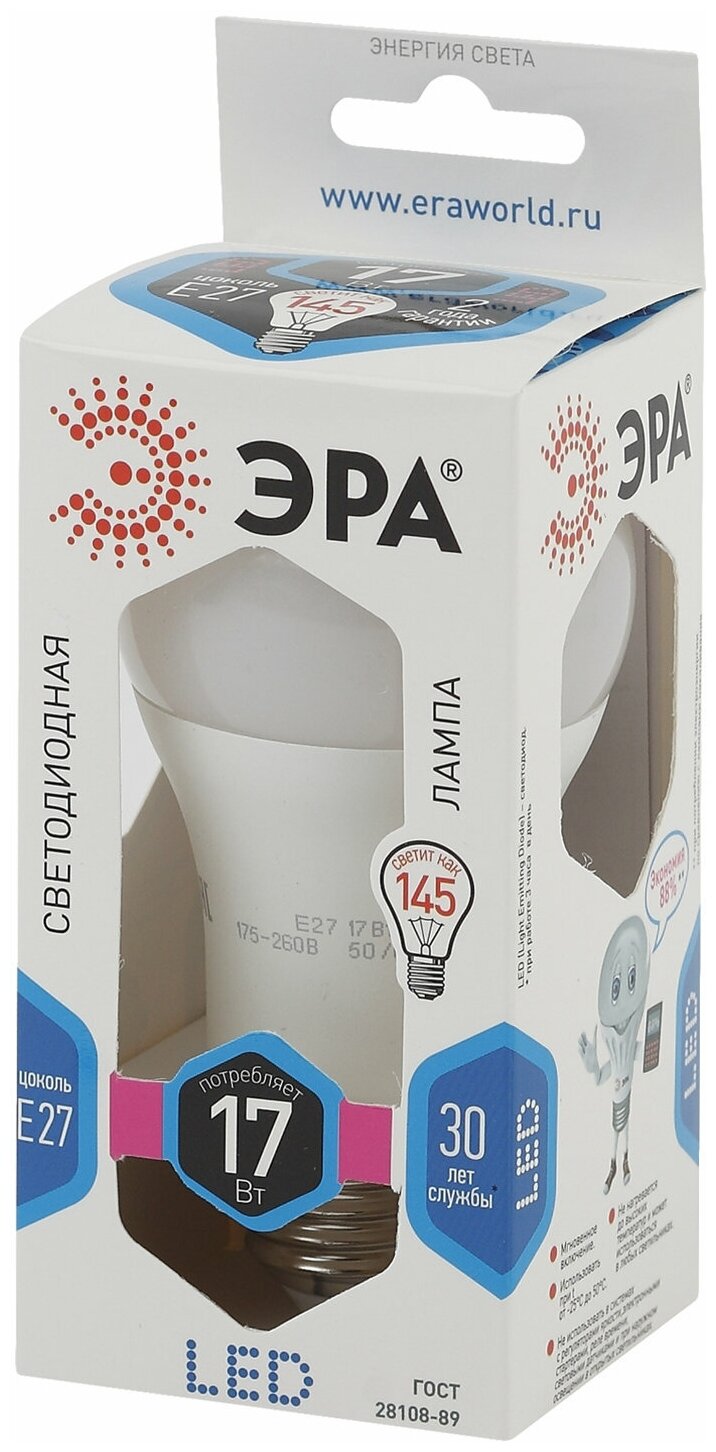 Лампа светодиодная ЭРА, 17 (145) Вт, цоколь E27, груша, нейтрал. белый, 25000 ч, smdA60-17w-840-E27. 454910 информация: