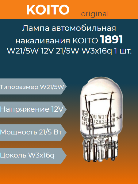 Лампа автомобильная накаливания KOITO 1891 W21/5W 12V 21/5W W3x16q 1 шт.