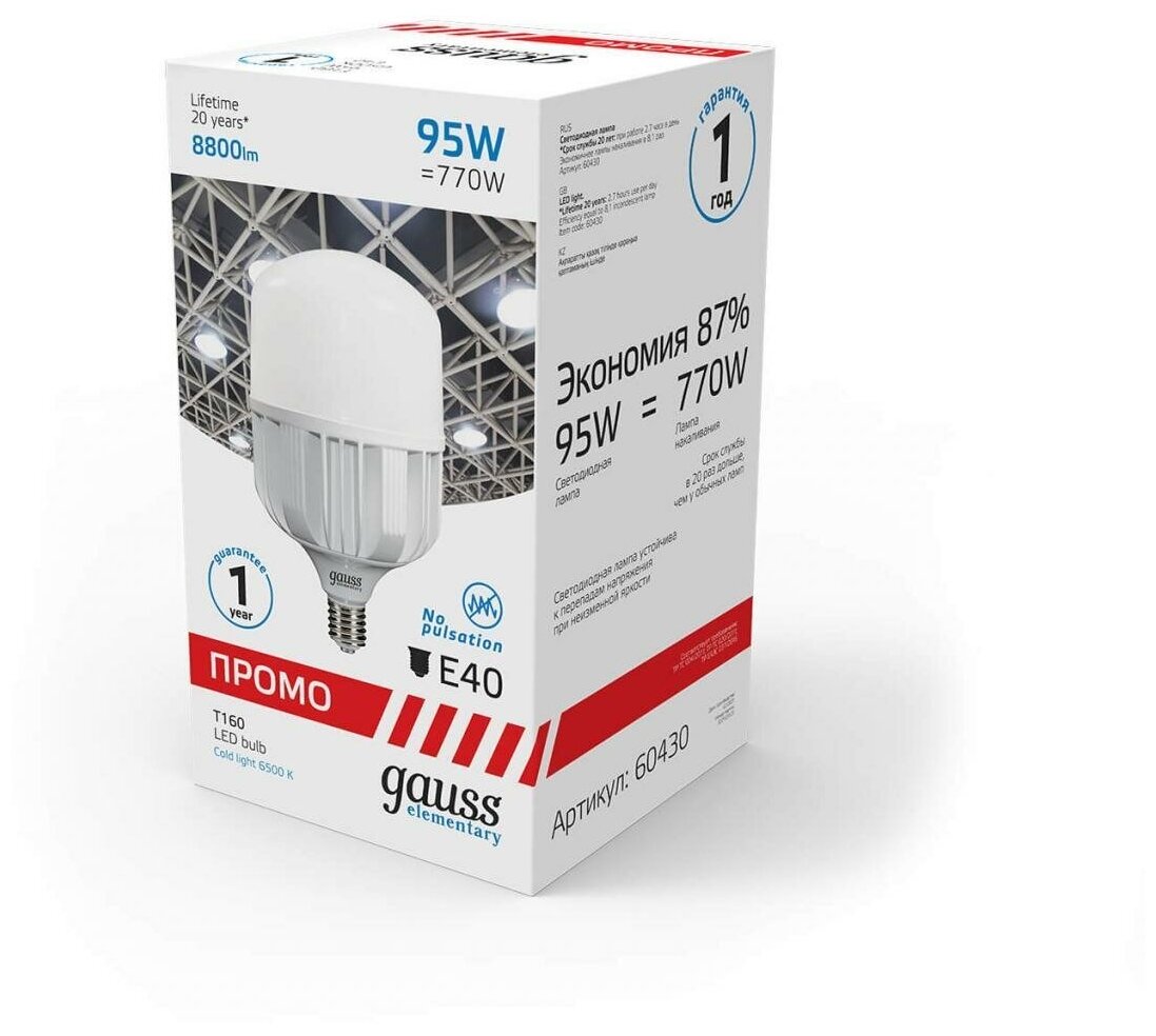 Отзывы на Лампа светодиодная Elementary 95Вт T160 цилиндр 6500К холод. бел. E40 8800лм Promo GAUSS 60430