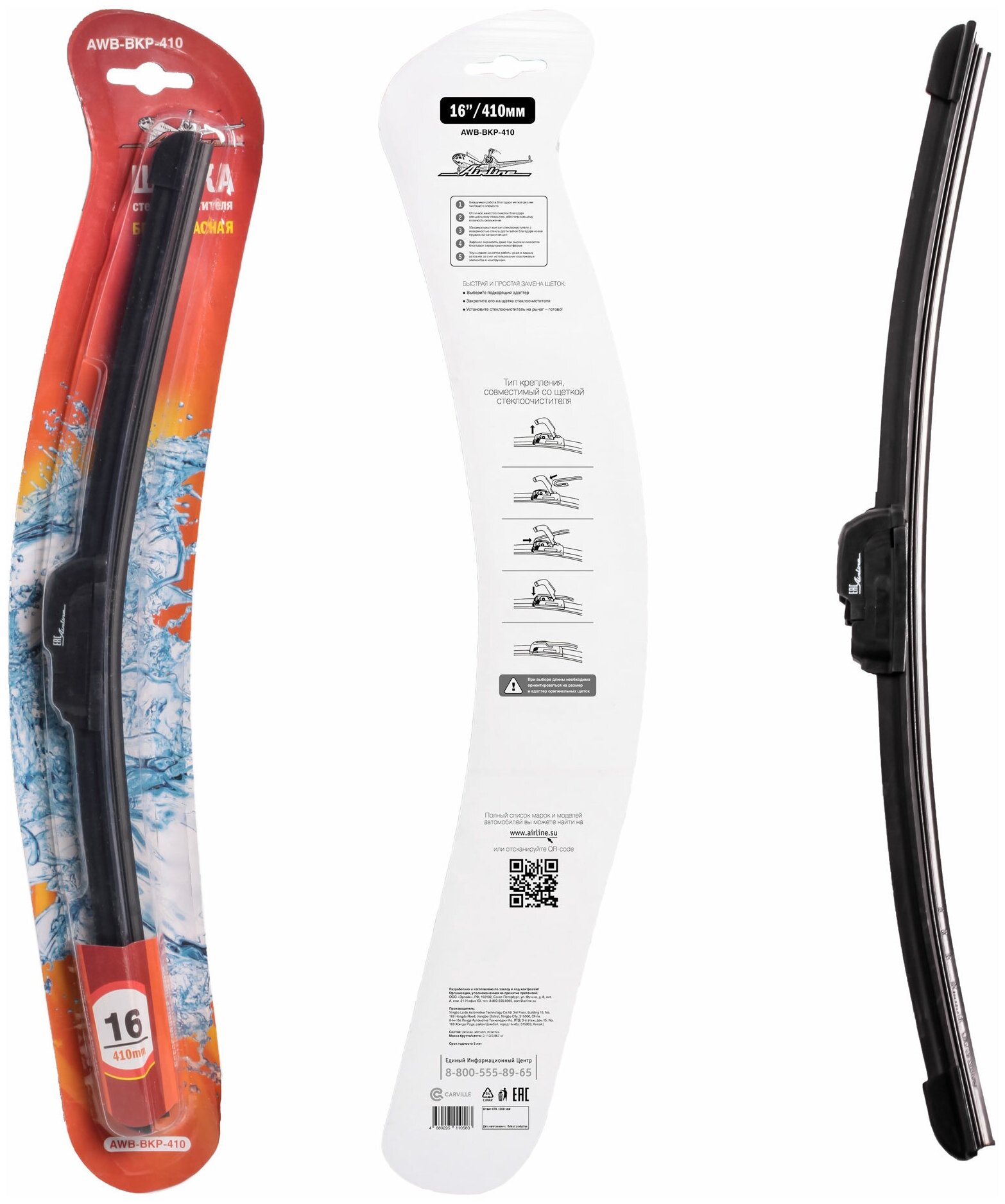 Щетка стеклоочистителя 400мм (16") бескаркасная, 1 адаптер (Hook 9x3, 9x4 mm - Крючок 9x3, 9x4 мм) AWB-BKP-410 AIRLINE 353 ₽