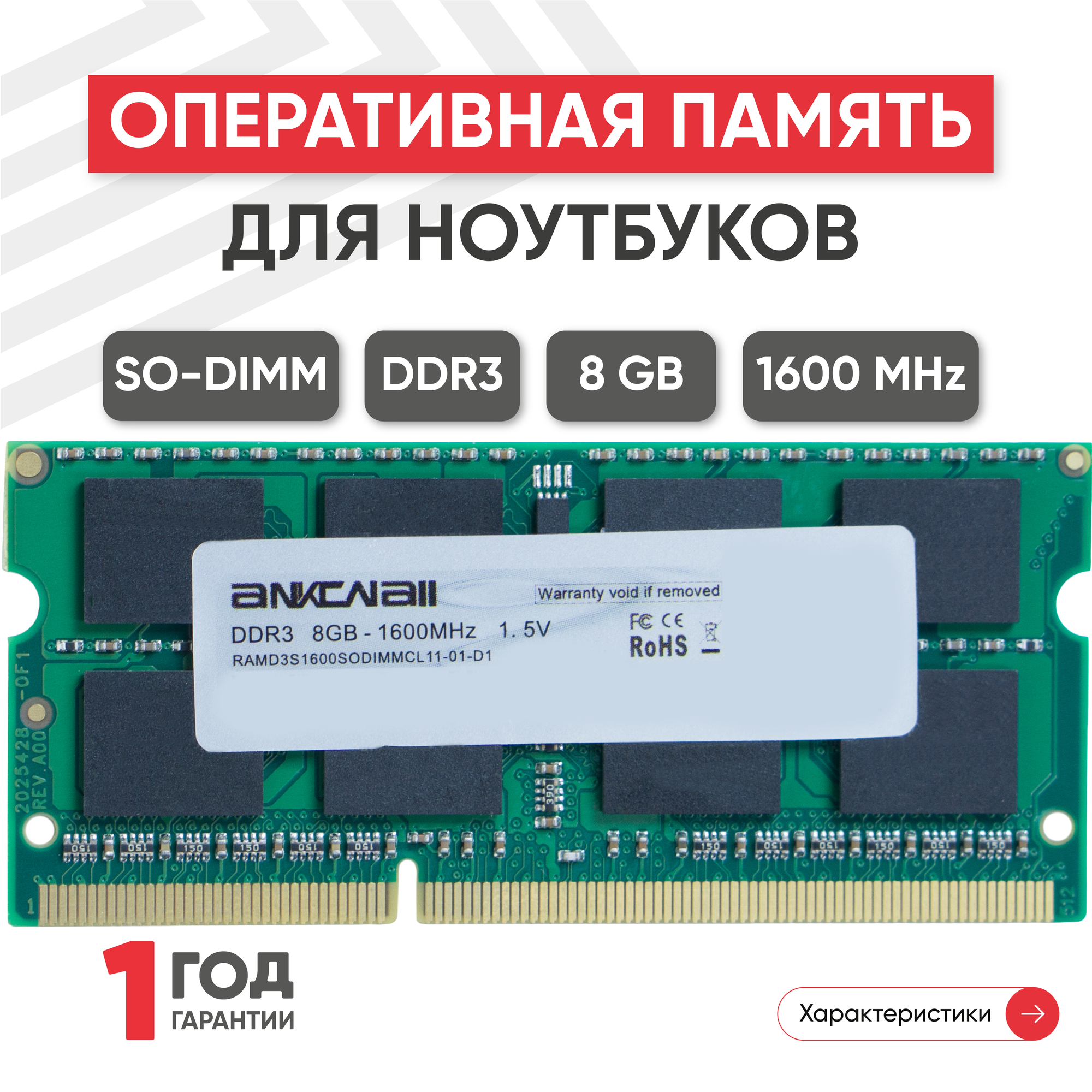 Модуль памяти Ankowall SODIMM DDR3, 8ГБ, 1600МГц, 1.5В, 204PIN, PC3-12800, CL11 11-11-11-28