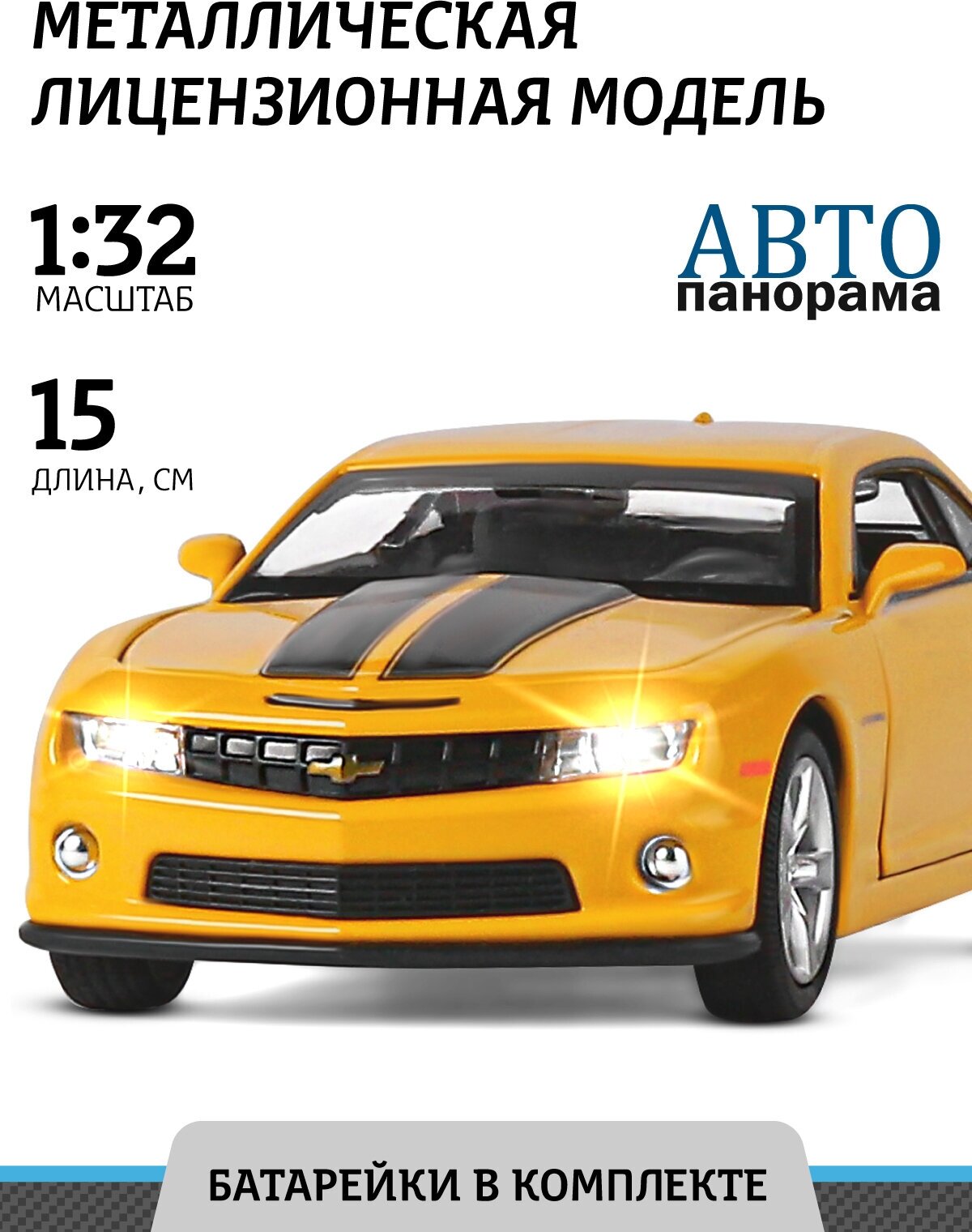 Модель машины инерционная Автопанорама 1:32 Chevrolet Camaro SS, желтый, свет, звук, открываются двери (JB1251155)