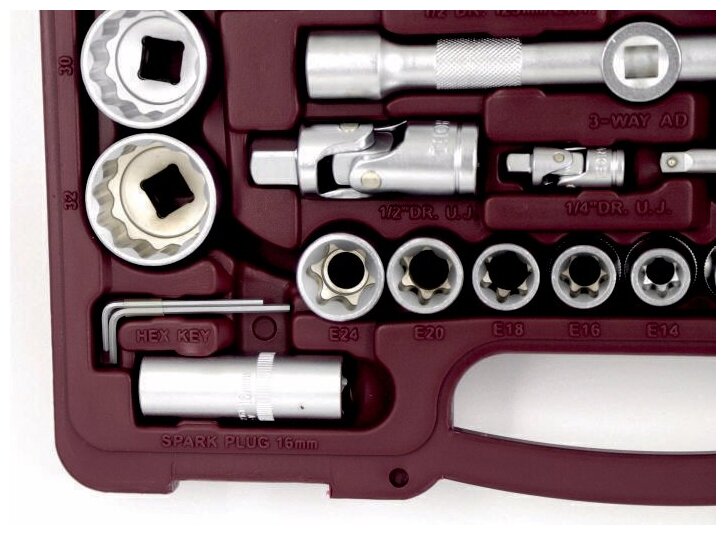 | Головки торцевые подробно | 1/4": 4, 4.5, 5, 5.5, 6, 7, 8, 9, 10, 11, 12, 13, 14 мм; длинные 1/4": 6, 7, 8, 9, 10, 11, 12, 13 мм; Torx 1/4": Е4, Е5, Е6, Е7, Е8; с битами 1/4": SL4, SL5.5, SL6.5, H3, H4, H5, H6, T8, T10, T15, T20, T25, Т27, T30, PH1, PH2, PZ1, PZ2; трещотка 1/4"; вороток т-образный 1/4"; свечная 3/8" (12-гр): 14 мм; удлинитель 1/4": 50, 100 мм; карданный шарнир 1/4"; 1/2" (12-гр): 10, 11, 12, 13, 14, 15, 16, 17, 18, 19, 21, 22, 24, 27, 30, 32 мм; длинные 1/2" (12-гр): 14, 15, 17, 19, 22 мм; Torx 1/2": Е10, Е11, Е12, Е14, Е16, Е18, Е20, Е22, Е24; трещотка 1/2"; карданный шарнир 1/2"; свечные 1/2": 16, 21 мм; удлинитель 1/2": 125, 250 мм |