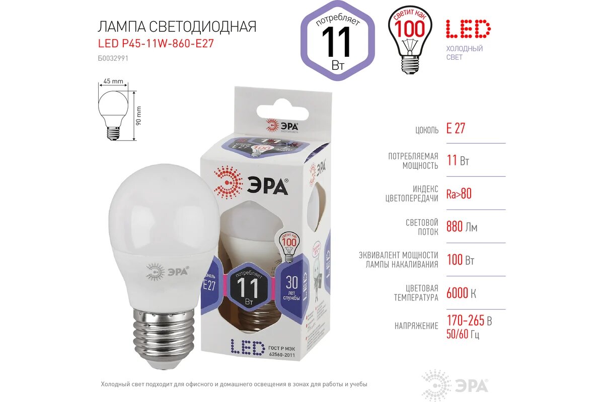 Лампа светодиод 11Вт шар Е27 6000К 880Лм матовая LED P45-11W-860-E27 ЭРА информация: