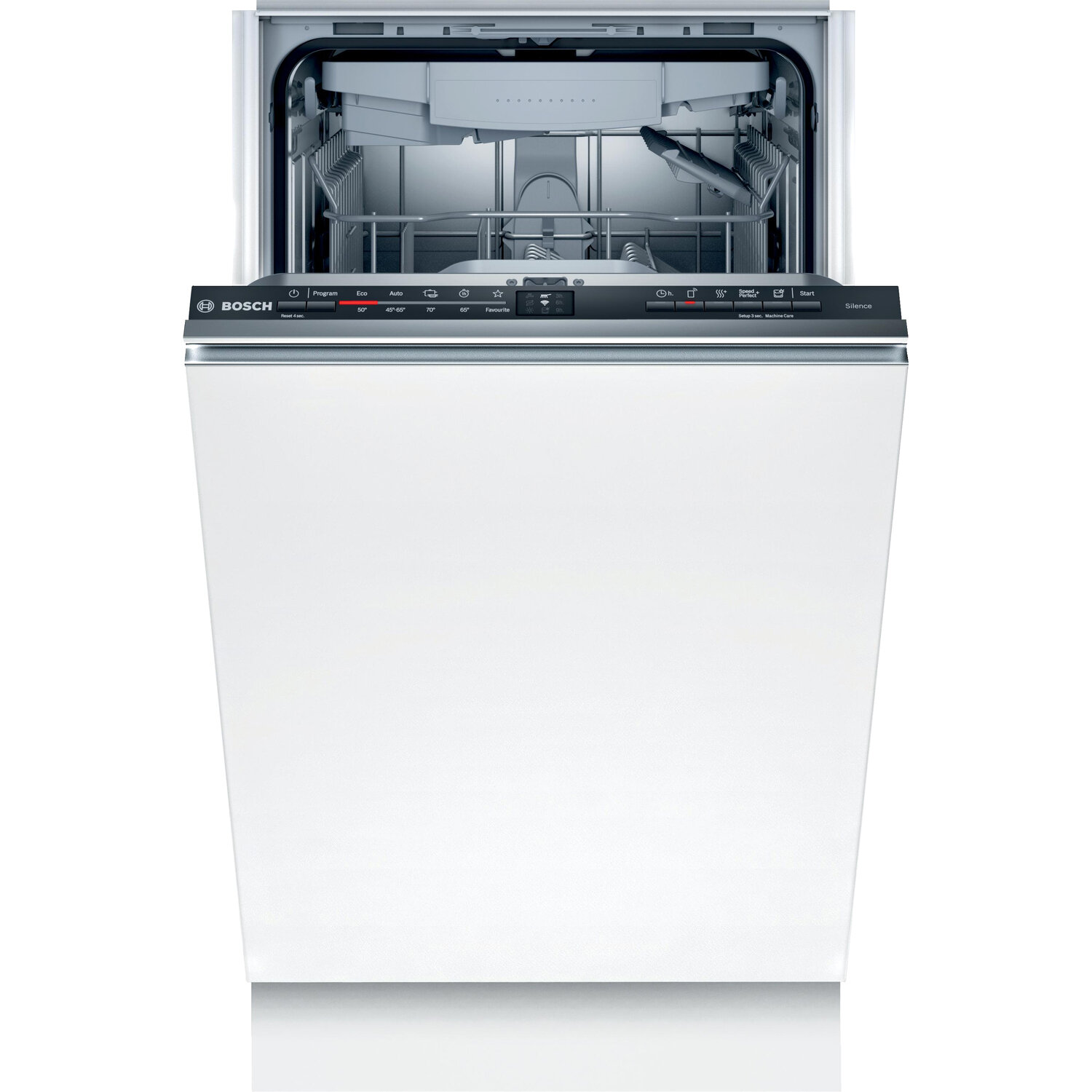Встраиваемая посудомоечная машина Bosch Serie 2, 45см., SilencePlus; Класс A-А-A; уровень шума 46 дБ; 5 прогр.: Авто 45-60°, Эко 50°, 1-часовая 65°, Ночная программа, 5 спец.ф-ция: Intensive Zone Extra Rinse Extra Dry SpeedPerfect и удаленный старт; отсро