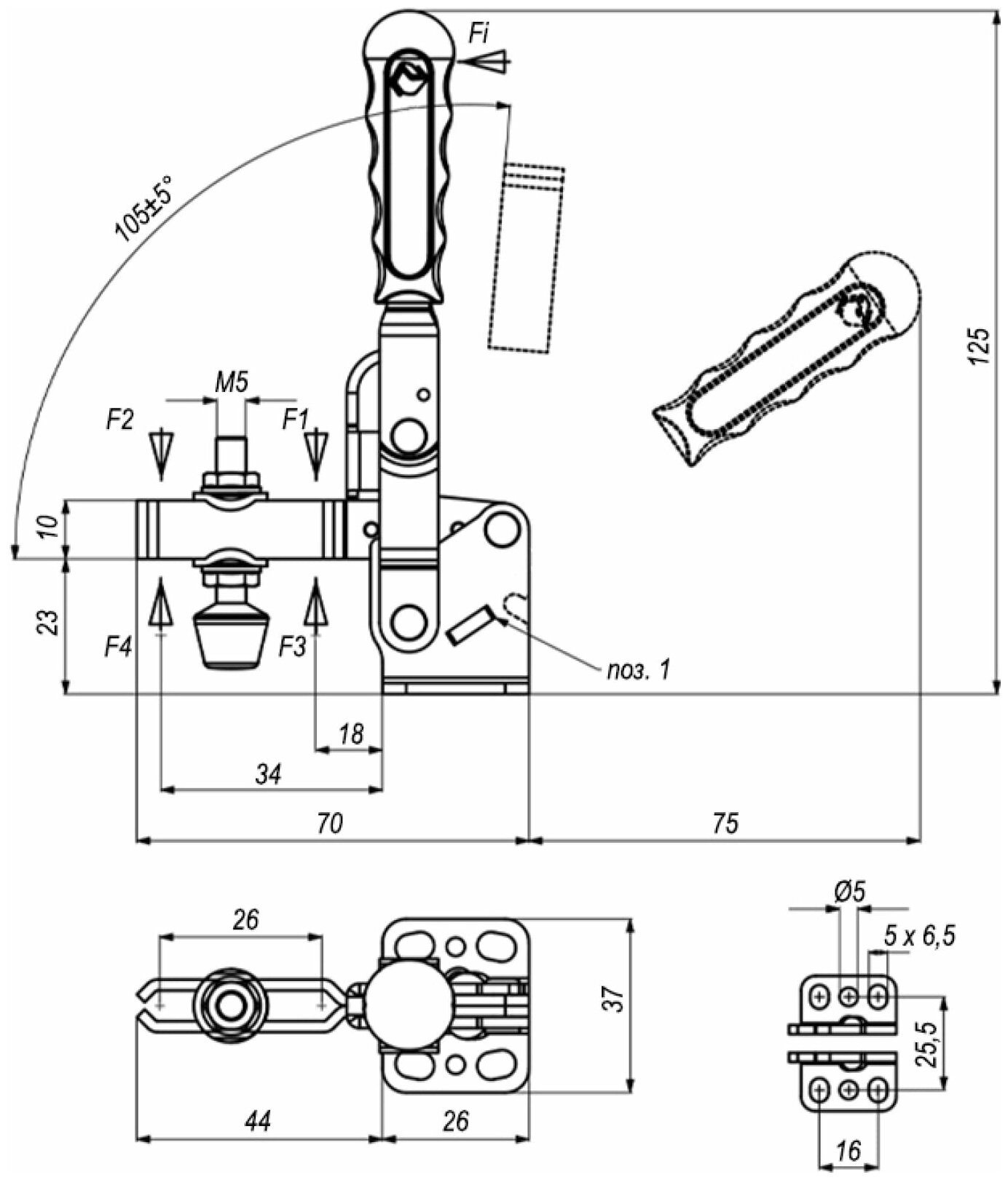 Прижим вертикальный со стопорной рукояткой KUKAMET 211-3-L, усилие 255 кг