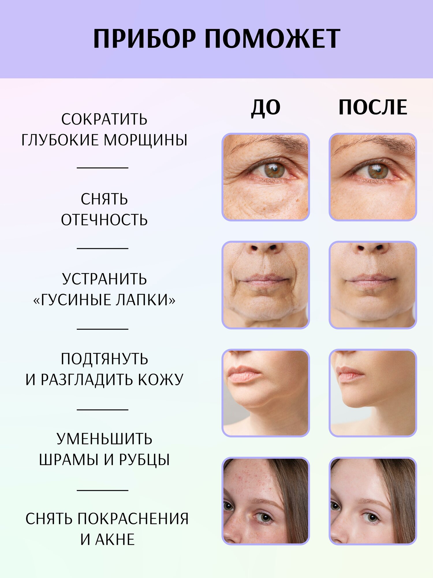 | Назначение | массаж / антивозрастной уход / усиление действия косметических средств / лечение акне |