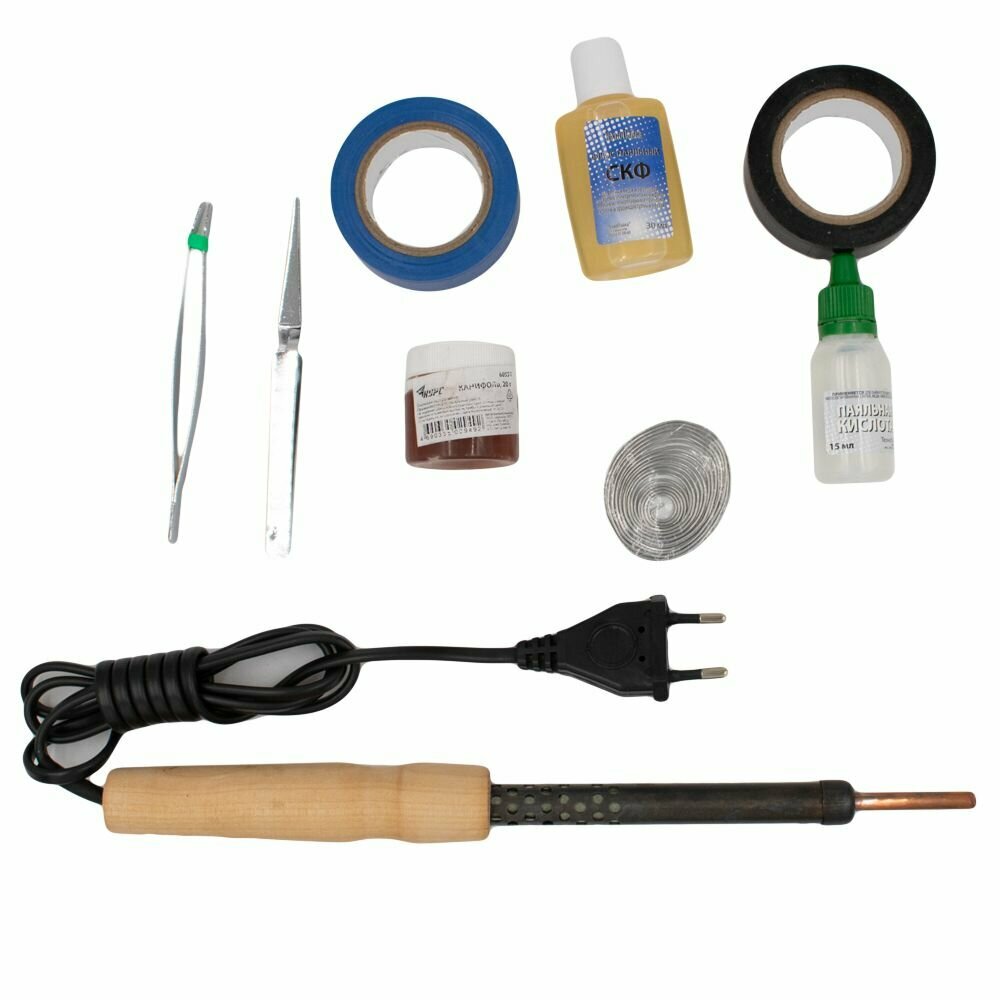 | Комплектация | органайзер, паяльник, подставка для паяльника, набор пинцетов, паяльная кислота, флюс скф, канифоль сосновая, пос-61, изолента 2 шт, инструкция |