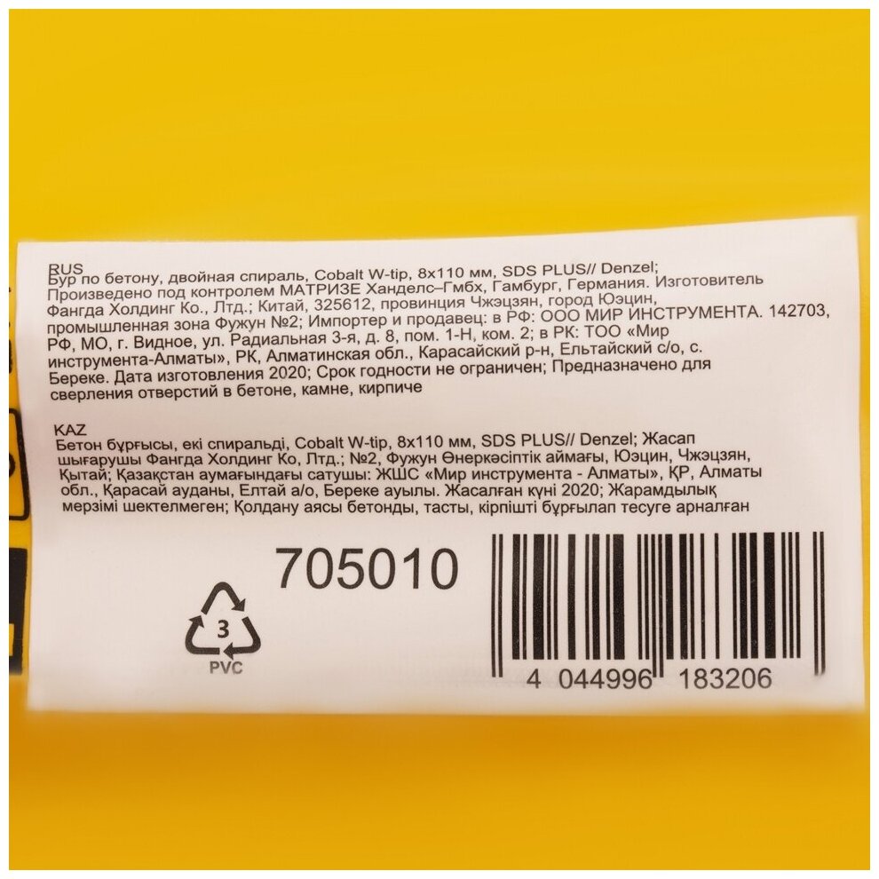 Бур по бетону, двойная спираль, Cobalt W-tip (8x110 мм; SDS PLUS) Denzel 705010 информация: