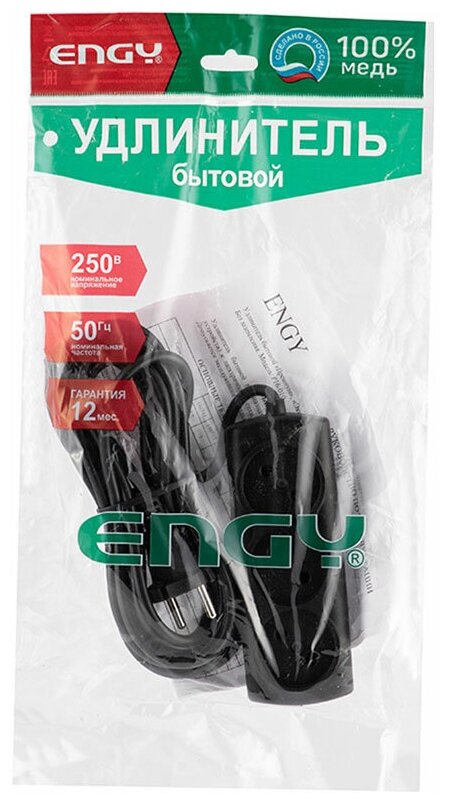 Удлинитель ENGY 186744, Премиум 5метров, 3розеток (ПВС 2*0,75) черный информация: