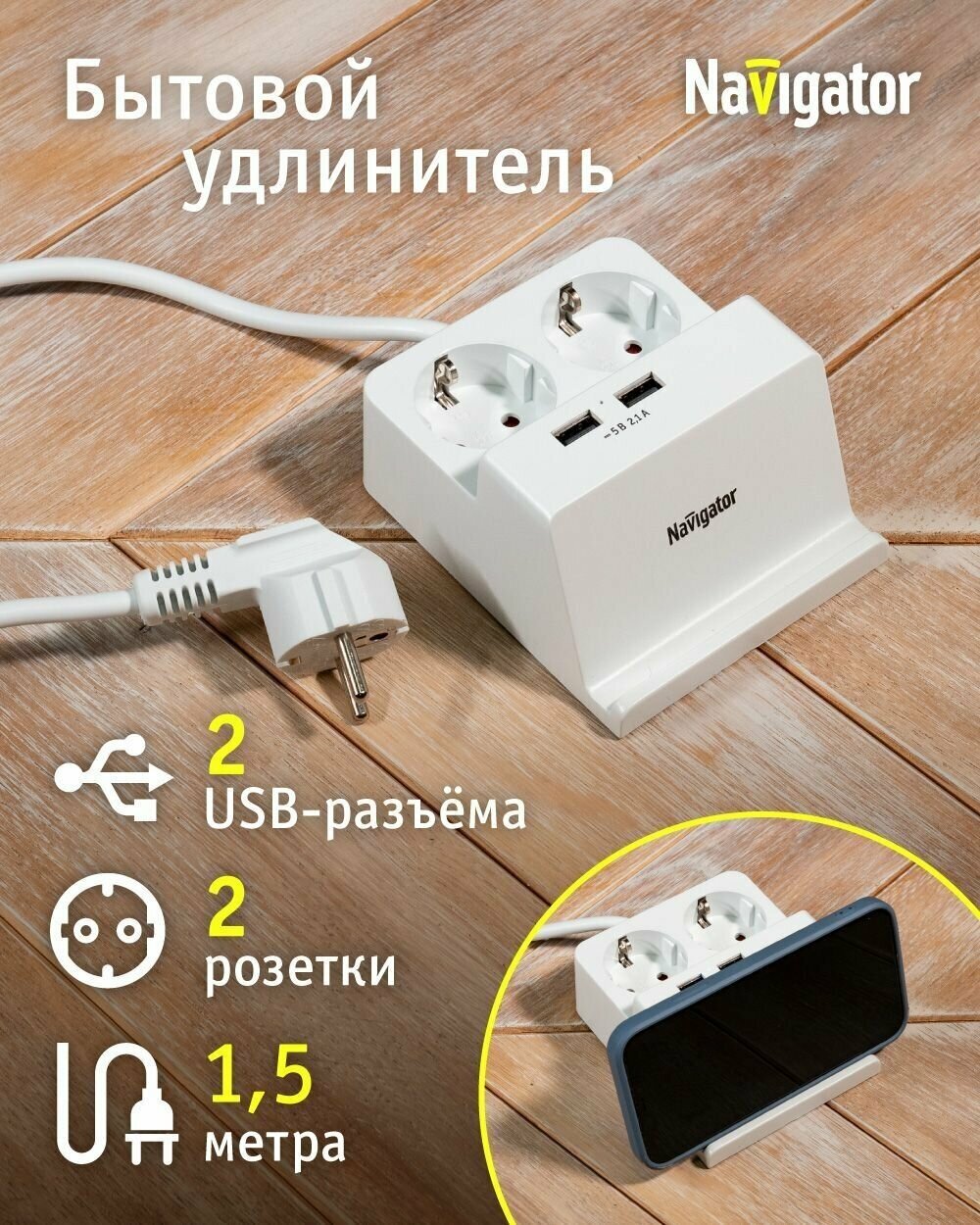 Удлинитель бытовой Navigator 61 457 с подставкой д/телефона, 2 розетки, с зазем, 1.8м, 2 USB-разъема