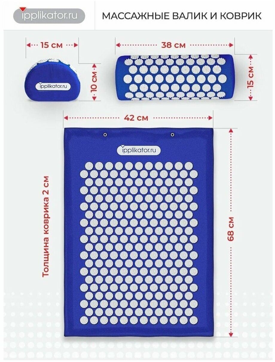 Аппликатор Кузнецова: Массажный набор акупунктурный игольчатый коврик + валик, синий. Сделано в России!