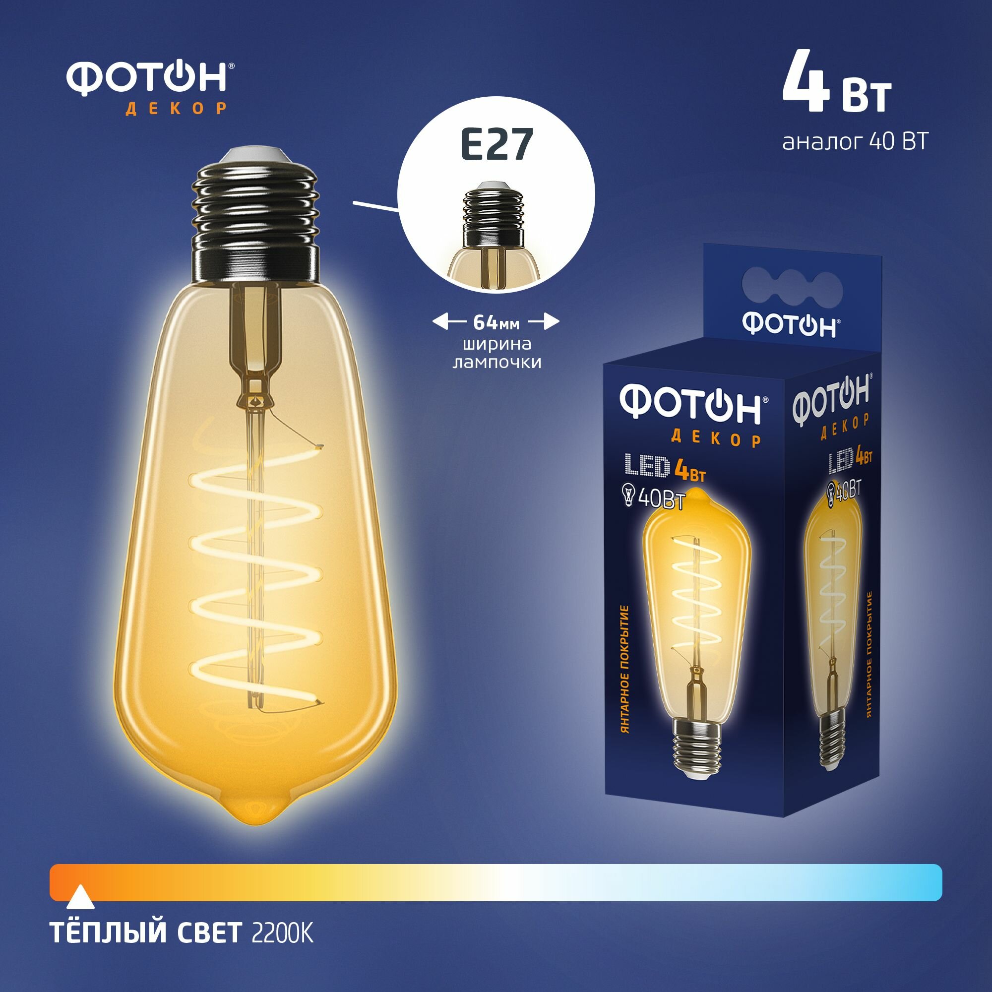 Фотон Лампа светодиодная филаментная LED FL ST64-S 4W E27 2200К, серия декор 23977 информация:
