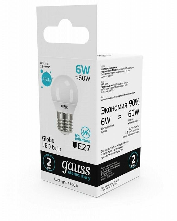 Лампа Gauss Elementary Шар 6W 450lm 4100K Е27 LED 220V информация:
