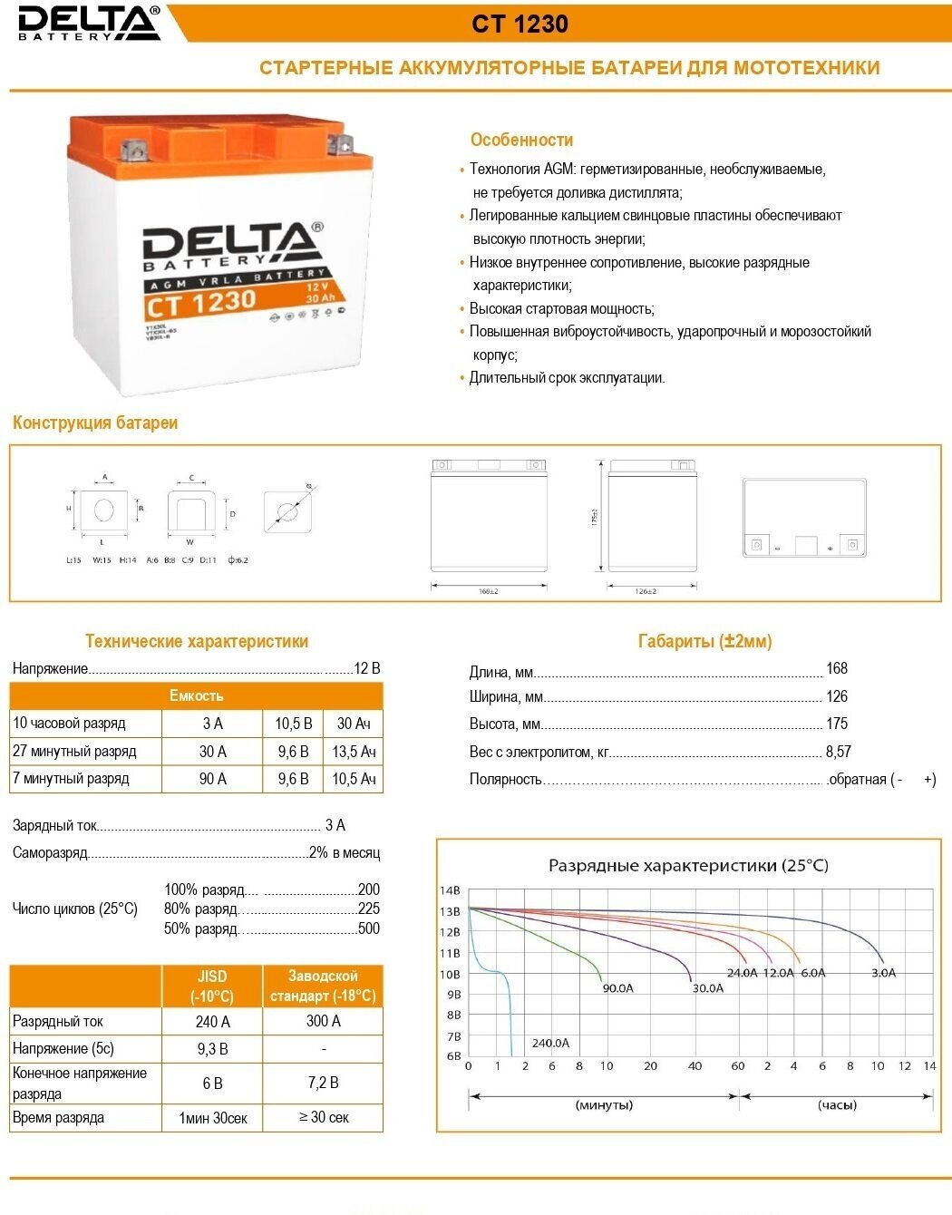 Отзывы на Аккумулятор Delta Battery Мото Agm 30 А/Ч Обратная R+ 168X126x175 Cca300 А DELTA battery арт. CT 1230
