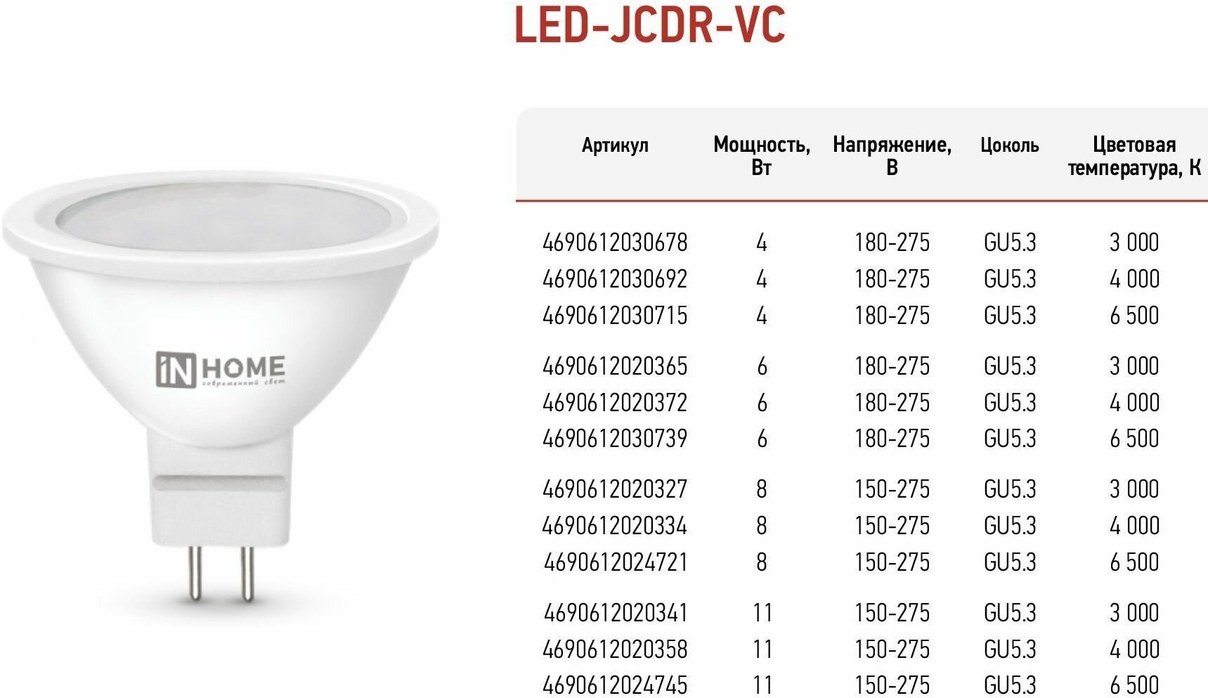 Лампа светодиодная LED-JCDR-VC 8Вт 230В GU5.3 3000К 720лм IN HOME 4690612020327 (80шт.в упак.) информация:
