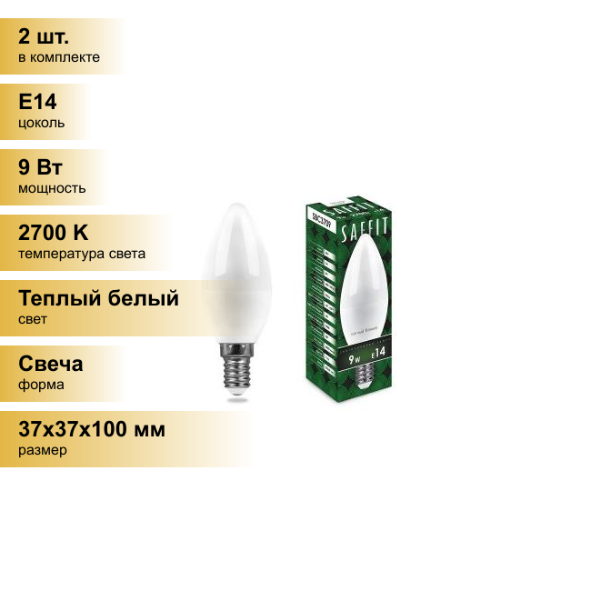 (20 шт.) Светодиодная лампочка Saffit свеча C37 E14 9W(810Lm) 2700K 2K матовая 100x37 SBC3709 55078 Теплый белый. Цоколь E14 2 413 ₽