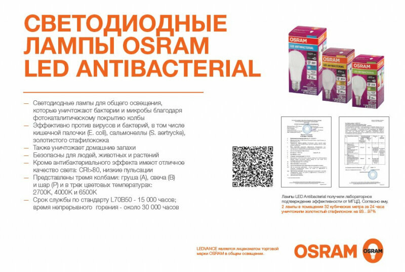 Отзывы на Светодиодная антибактериальная лампа OSRAM LCCLB60 7,5W/865 230VFR E14 806lm