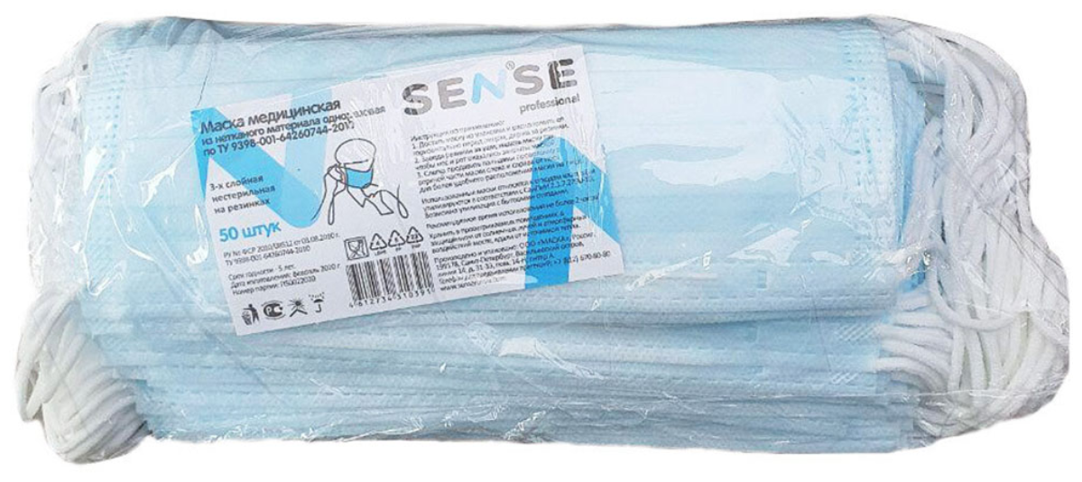 10 цен на Маски медицинские одноразовые трехслойные Sense (50 шт)