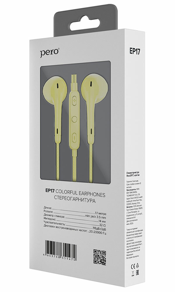 Наушники проводные Pero EP17 желтая . информация: