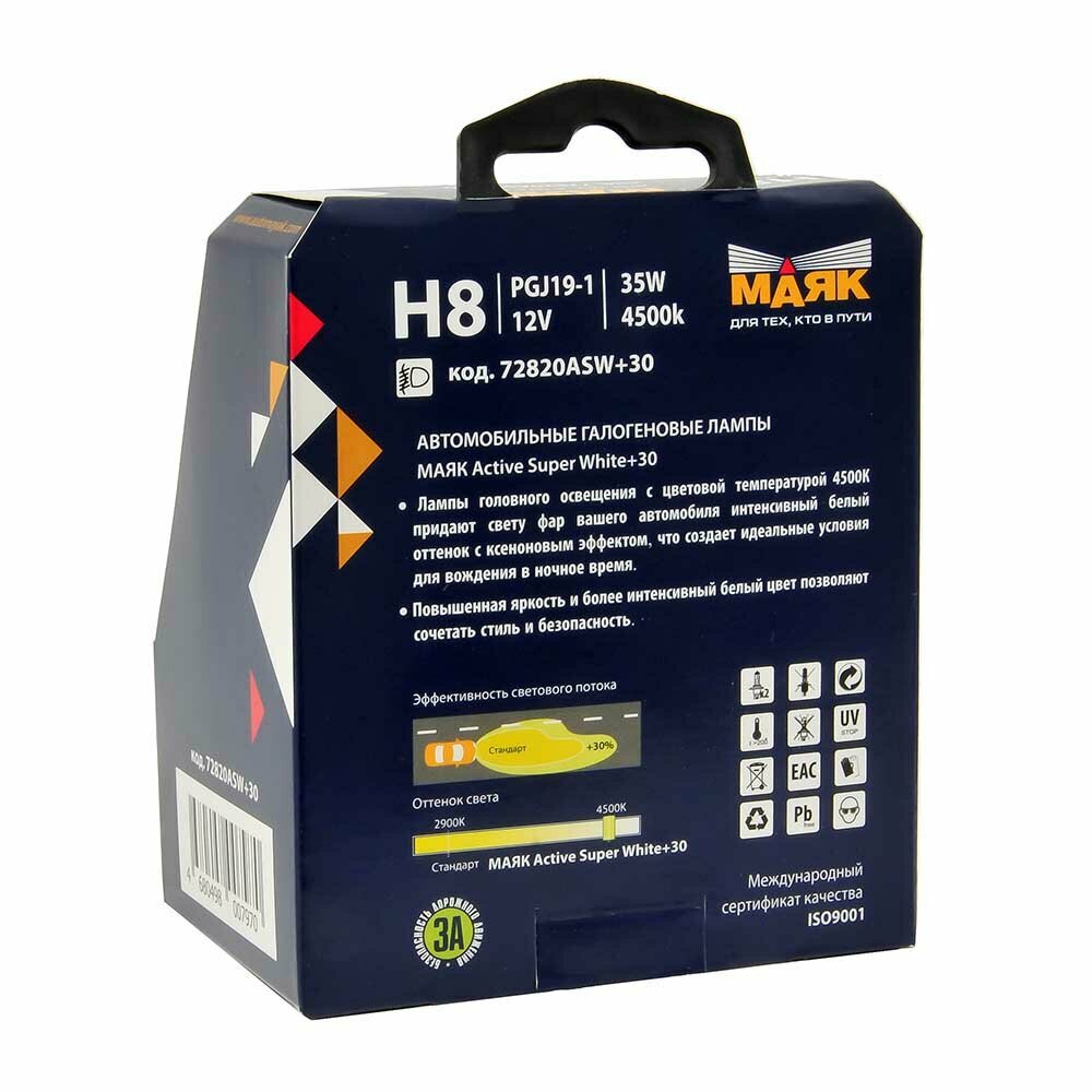 72820ASW30 маяк Лампа галогеновая H8 PGJ19-1 Active Super White + 30% 12V цена за комплект