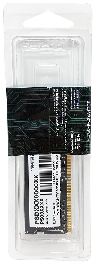 Модуль памяти Patriot Signature PSD48G266682S, объем 1 х 8Gb, форм-фактор SO-DIMM 260-pin, тип памяти DDR4, рабочая частота 2666MHz, тайминги 19-19-19-43, unbuffered
