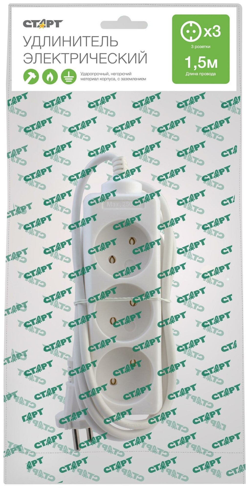 Старт 4607175852678 Удлинитель 3 розетки. С У S 3x1. Длина провода 1,5 м. Без заземления.