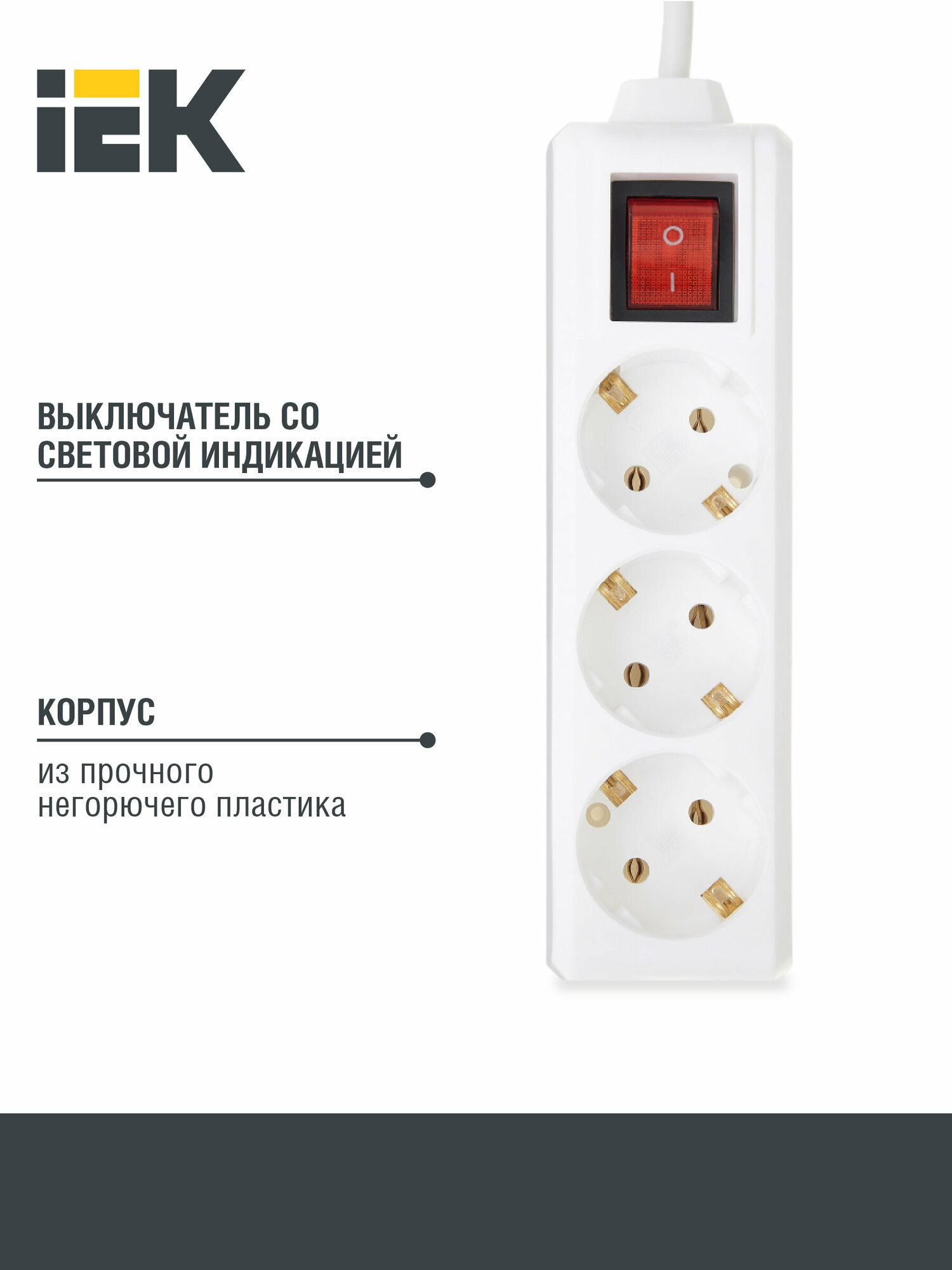Удлинитель с выключателем IEK У03К-выкл, ПВС 3 x 1 мм², с заземлением, 3 розетки, 5 м, белый