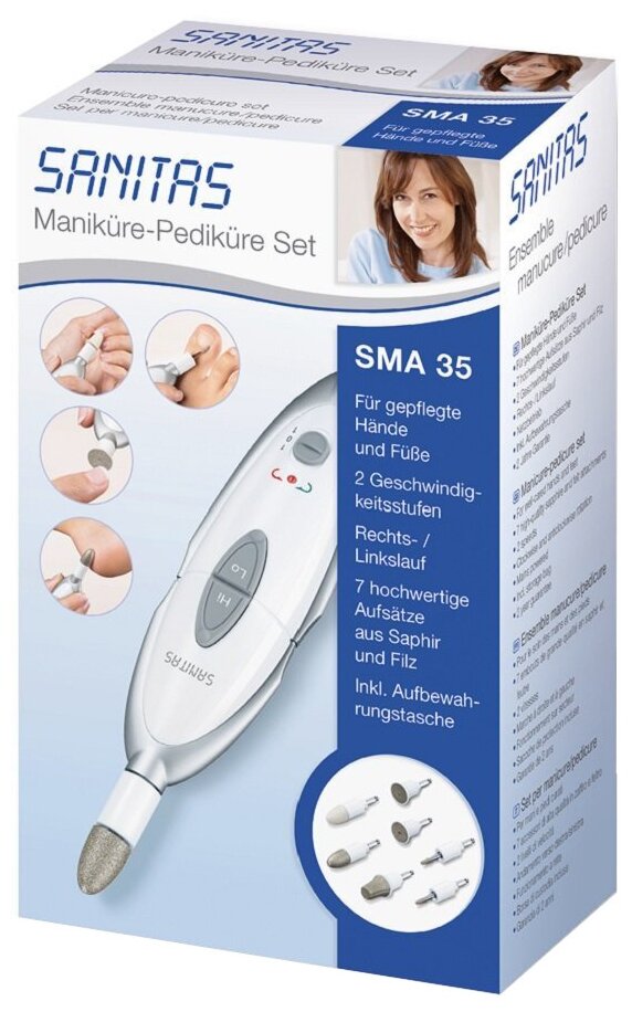 Набор для маникюра и педикюра с 7 насадками Sanitas SMA35, белый информация: