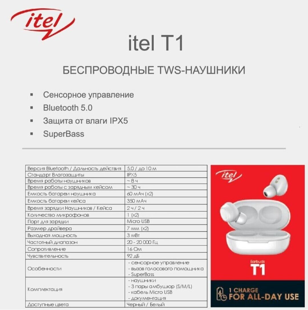 Беспроводные наушники Itel Earbuds T1 White информация: