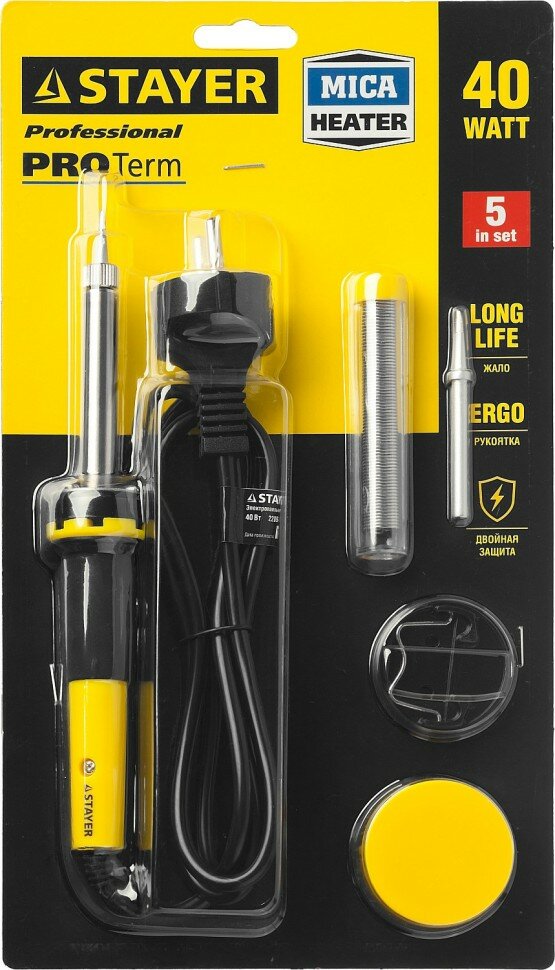 Набор для паяльных работ STAYER "PROFI" PROTerm, 55312-40-H5, паяльник 55300 + подставка + припой + жало сменное + канифоль, 40 Вт