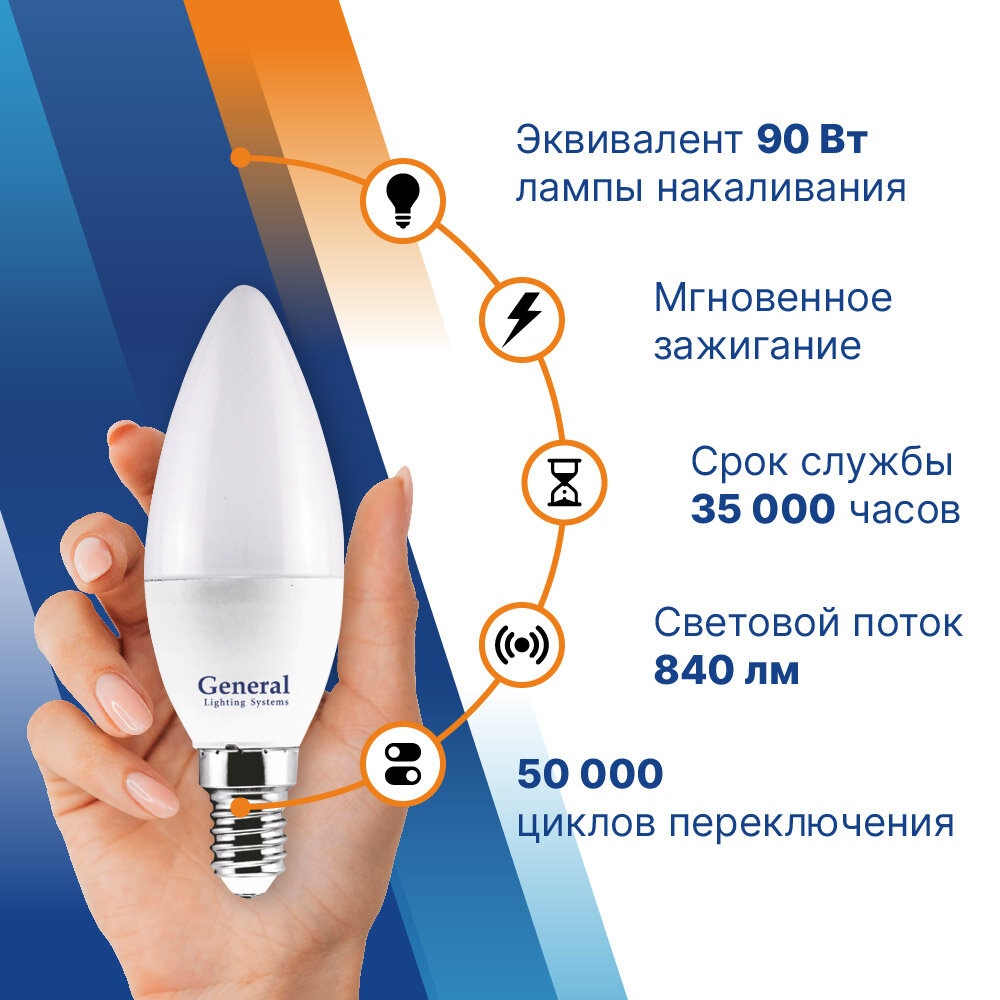 General свеча C37 E14 10W 4500K 4K 35х105 пластик/алюм GLDEN-CF-10-230-E14-4500, 682800 информация: