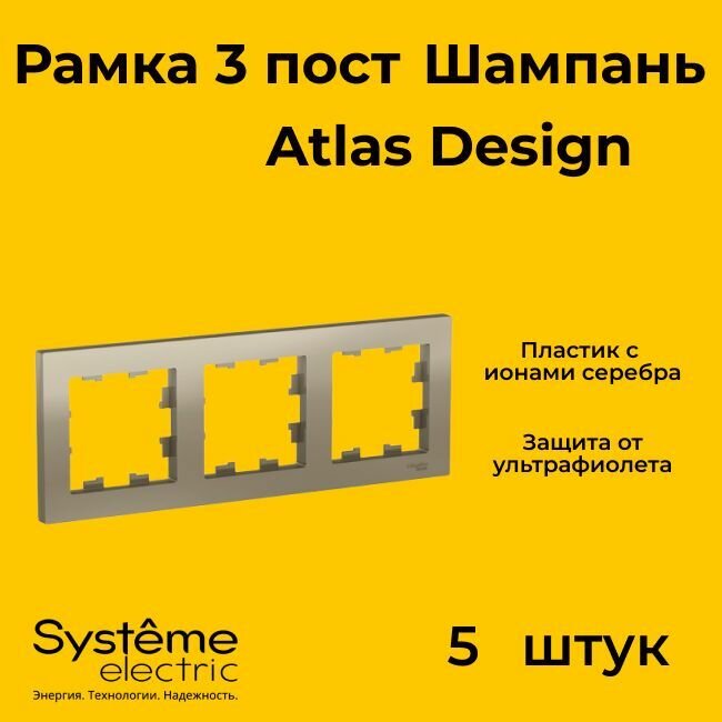 Рамка для розетки выключателя тройная Schneider Electric (Systeme Electric) Atlas Design Антибактериальное покрытие Шампань ATN000503 5шт информация: