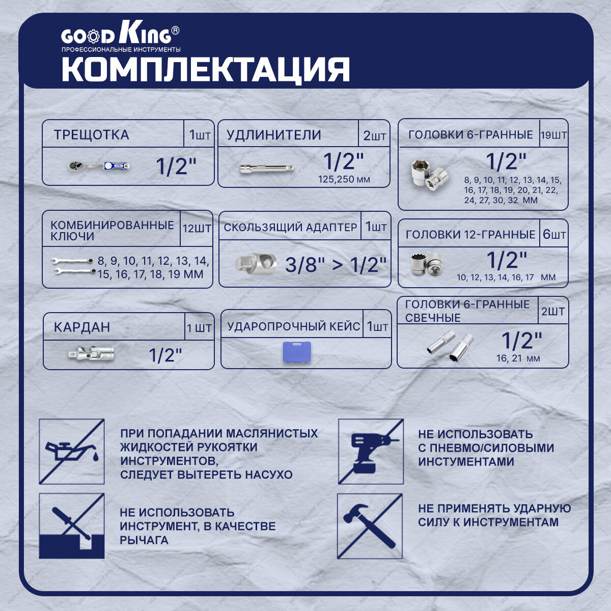 | Головки торцевые подробно | 19 шт. — 1/2" Шестигранные головки: 8, 9, 10, 11, 12, 13, 14, 15, 16, 17, 18, 19, 20, 21, 22, 24, 27, 30, 32 мм |